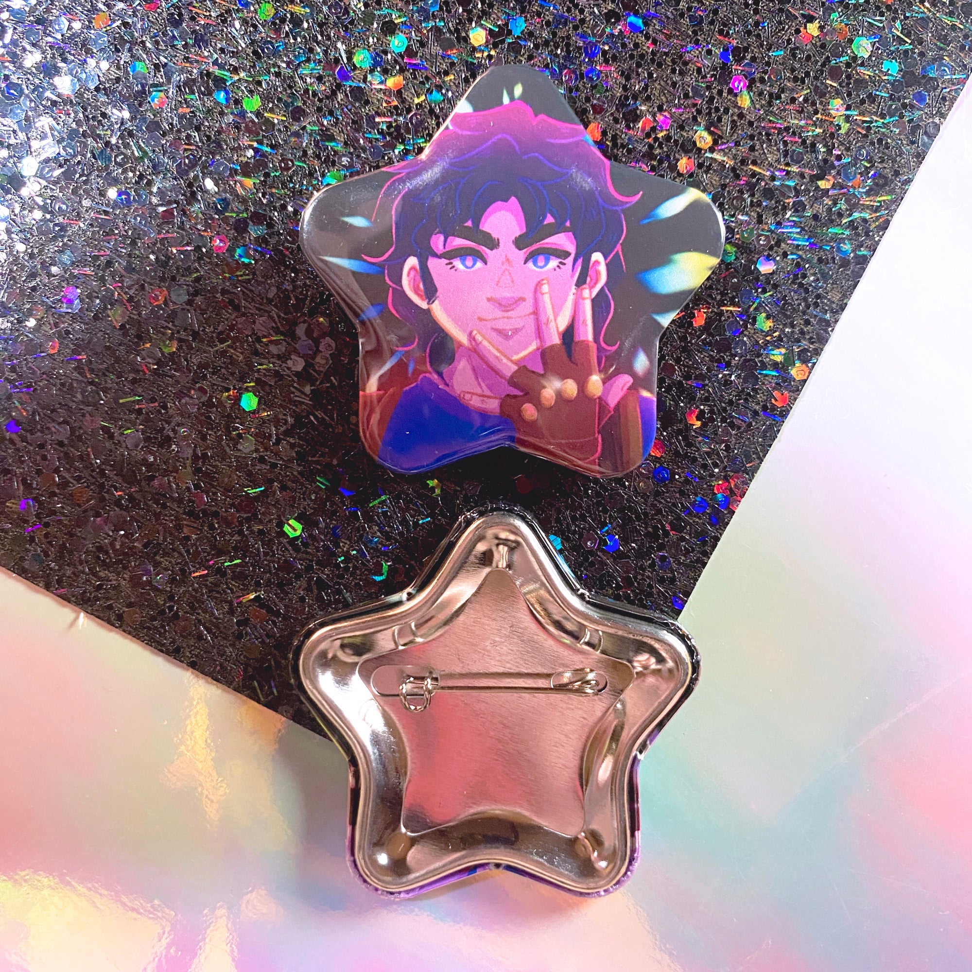 2.25" star shaped button featuring Jonathan Joestar and his descendants from across time and space. The front of the button features the protagonist in front of a black background with prismatic rainbow detailing. The back has a sturdy pin. The button is approximately 2.25" tall, but due to the shape it looks smaller than it is.
