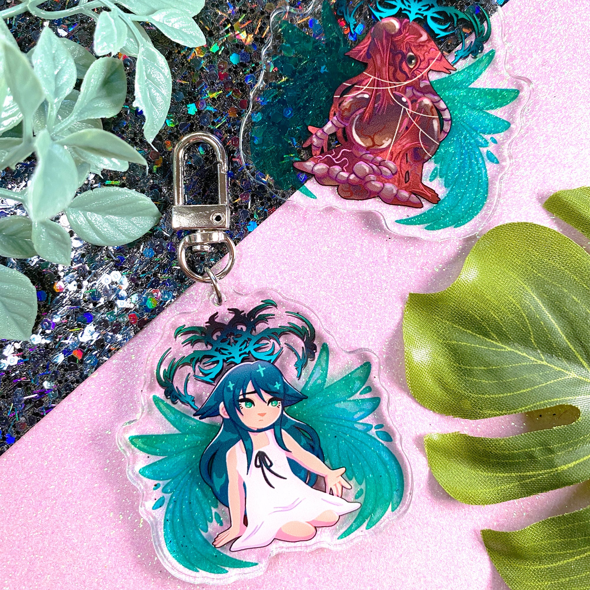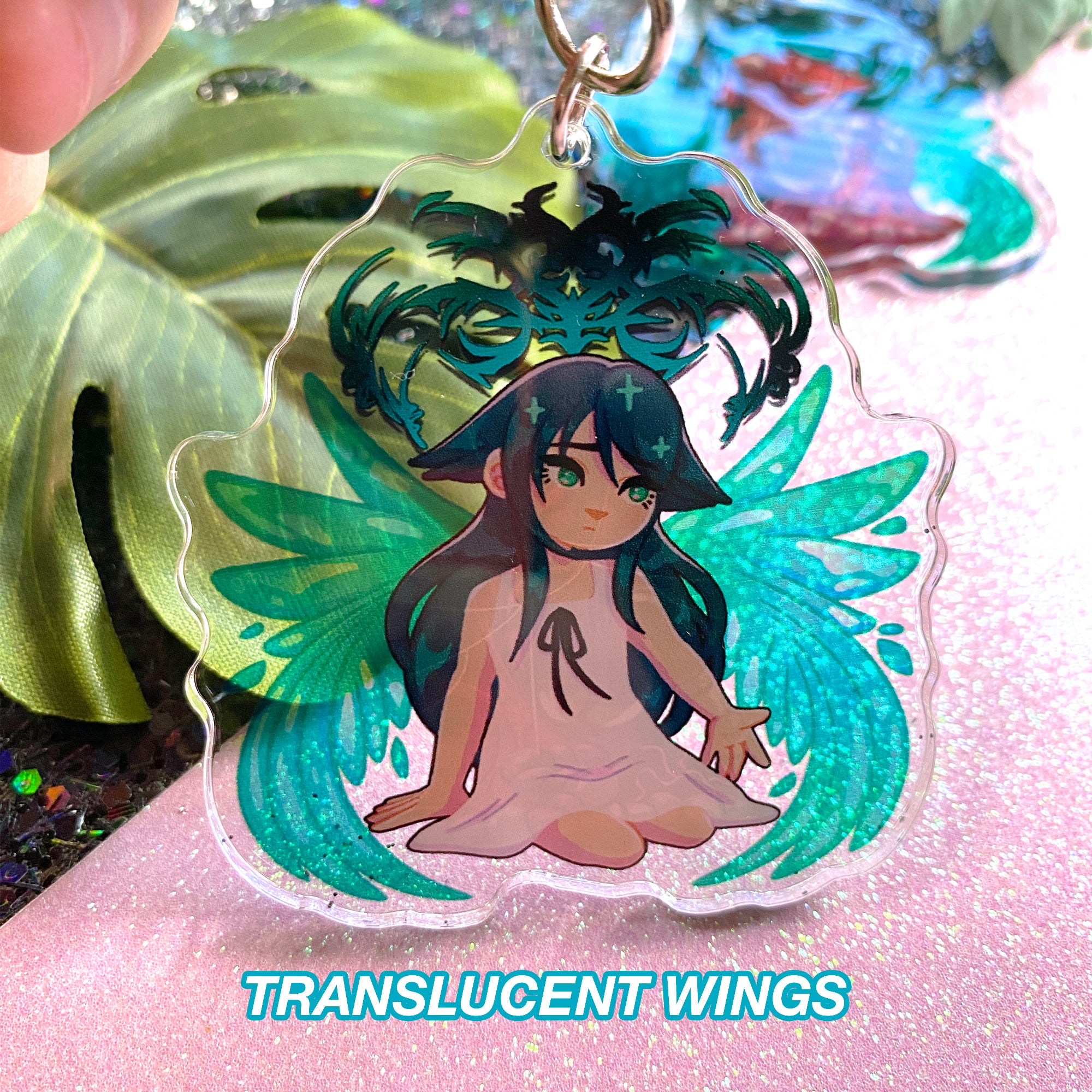 This is a 2.75in / 7cm tall acrylic keychain with a different front and back design. The front of the charm depicts Saya kneeling on the ground with her wings extended behind her. The wings are translucent so they glow in the sunlight. The backside of the design features a pile of meat and gore, inspired by Saya's true form. There is a cybersigil-inspired heart floating above her on both sides.