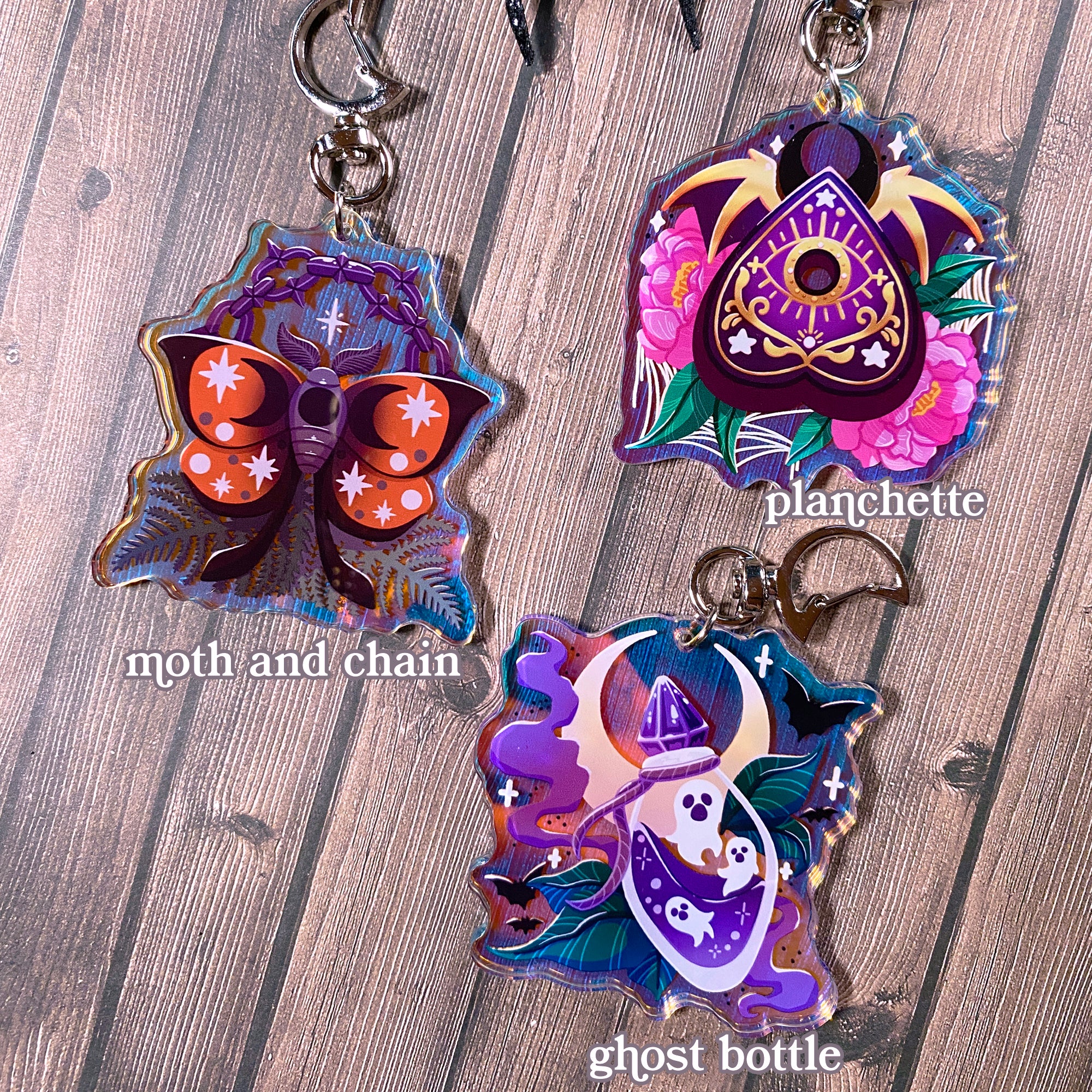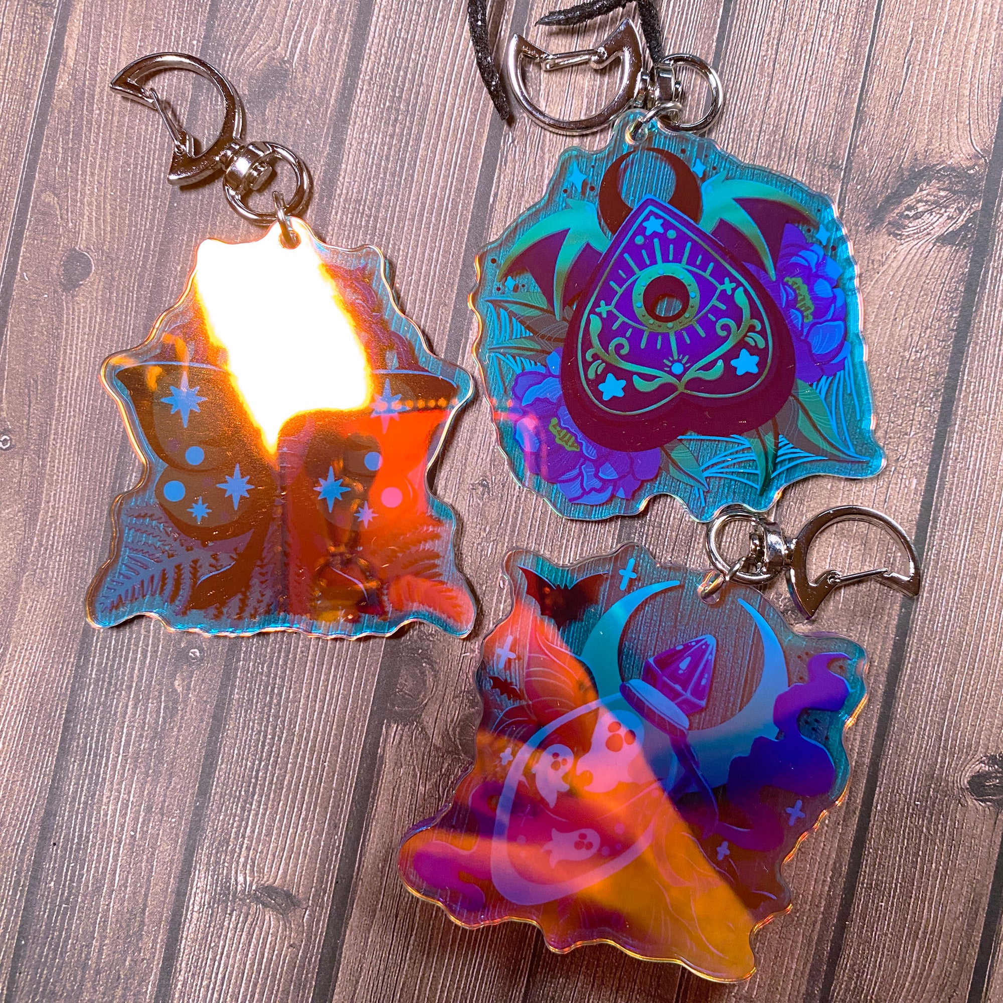 2.5 inch tall acrylic keychains printed on iridescent rainbow acrylic. Each design has a silver moon keychain. These are technically double sided but the backside is obscured due to the acrylic type.